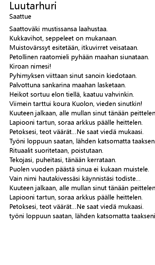 | Kuuteen jalkaan, alle mullan sinut t n n peittelen. | |