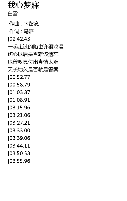 | [02:45.26][02:42.43][02:39.60][00:24.32][00:21.61][00:18.85] | 我心梦寐 |