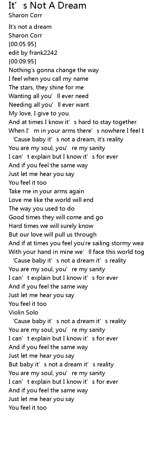| [00:48.23] | ' Cause baby it' s not a dream, it' s reality |