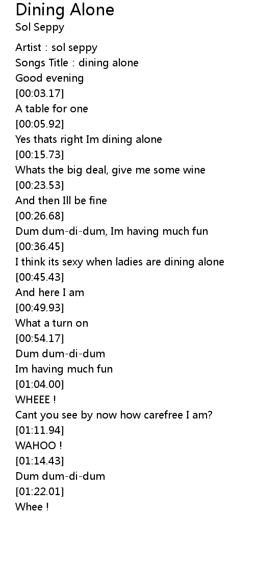 | [00:09.41] | Yes thats right Im dining alone |