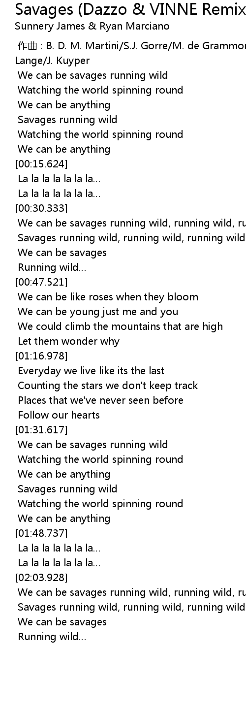 | [02:19.405] | We can be savages running wild, running wild, running wild |