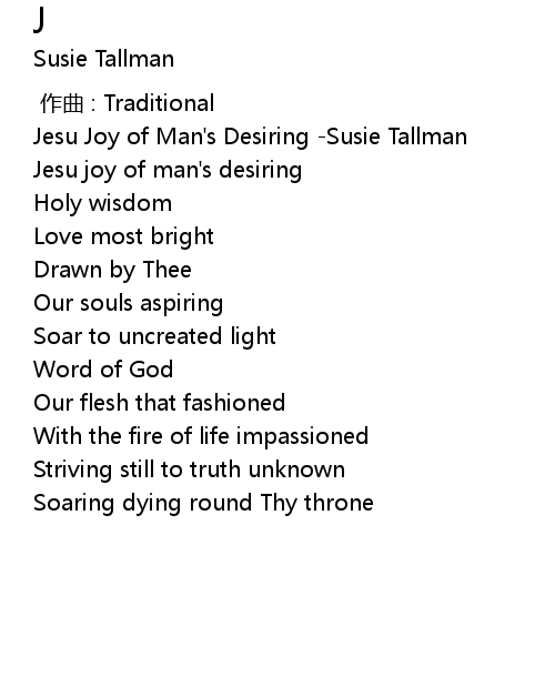 | [00:00.511] | Jesu Joy of Man' s Desiring Susie Tallman |