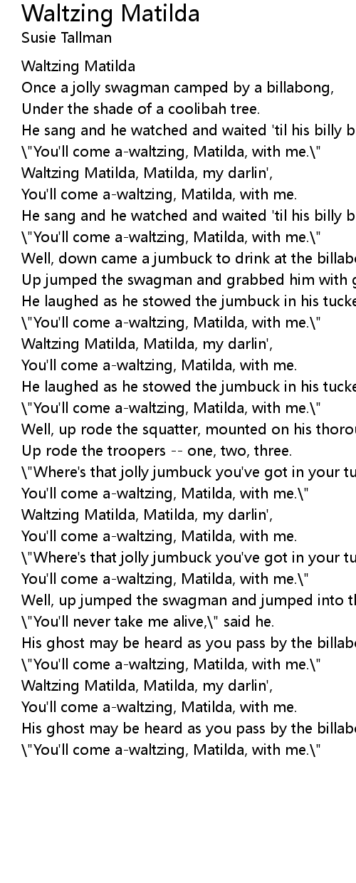 You'll come a-waltzing, Matilda, with me.\" |
