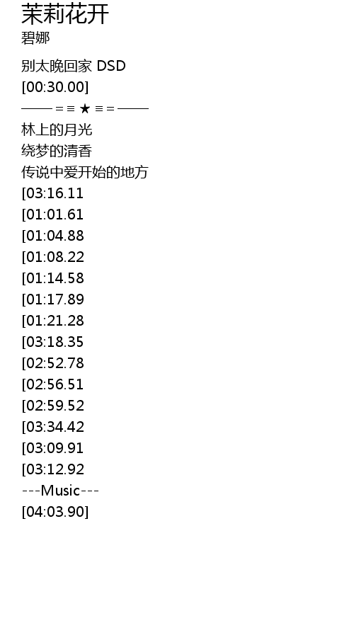 | [03:31.70][03:18.35][03:03.30][02:50.11][01:41.68][01:28.30] | 茉莉花盛开 |