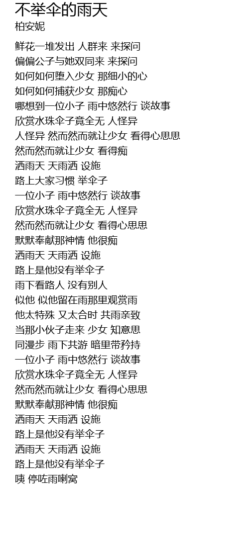 | [01:32.12] | 欣赏水珠伞子竟全无 人怪异 |