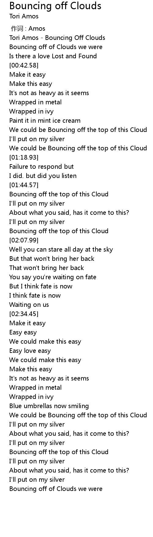 | [00:00.75] | Tori Amos Bouncing Off Clouds |
