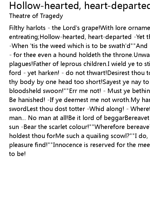 Filthy harlots - the Lord's grape!With lore ornamented entreating;Hollow-hearted, heart-departed -Yet thou reapest the blooming rose -When 'tis the weed which is to be swath'd""And me in the yesterday bind?!""Hah! - for thee even a hound holdeth the throne.Unwanted child of mother! - Plague of plagues!Father of leprous children.I wield ye to stint this brawl!Night is the ford - yet harken! - do not thwart!Desirest thou to do it withal,I shall cause thy body by one head too short!Sayest ye nay to my boon,Then wilt thou from bloodsheld swoon!""Err me not! - Must ye bethink my foolhardiness!Be vanished! - Be hanished! -If ye deemest me not wroth.My hand hieth to unsheathe the swordLest thou dost totter -Whid along! - Wherefore irk my haughtiness?""No man... No man at all!Be it lord of beggarBereaveth my dignity!""Loom my darling sun -Bear the scarlet colour!""Wherefore bereaveThe kine of the sward?Wherefore holdest thou forMe such a quailing scowl?""I do, in the blooming flower, pleasure find!""Innocence is reserved for the meek:Of naught is my grasp ne'er to be! |