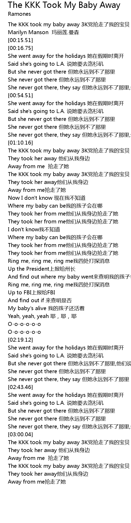 | [00:14.00] | The KKK took my baby away 3K dang qiang zou le wo de bao bei |