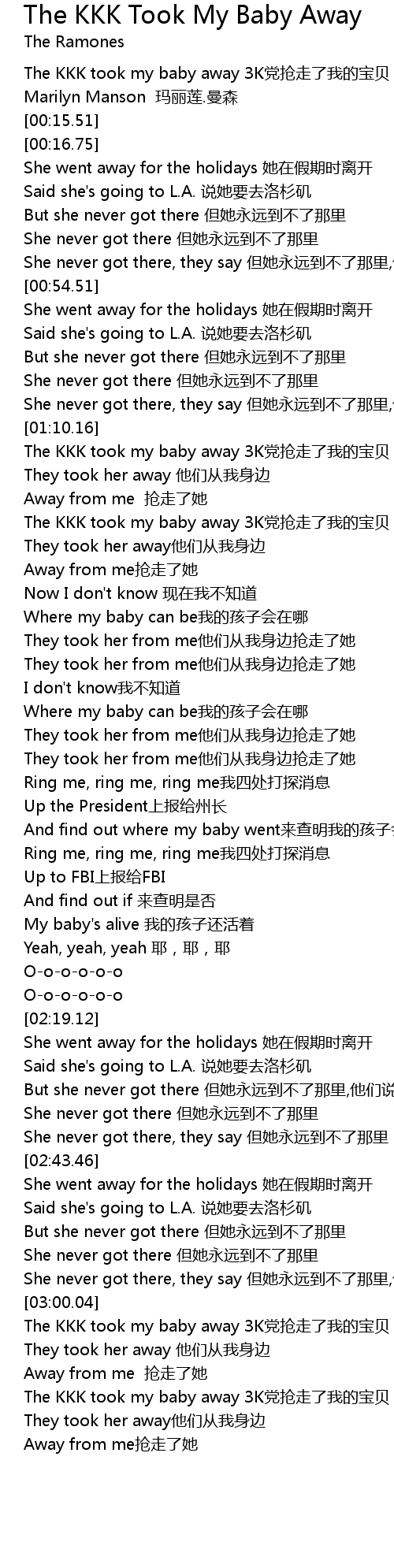 | [00:14.00] | The KKK took my baby away 3K dang qiang zou le wo de bao bei |