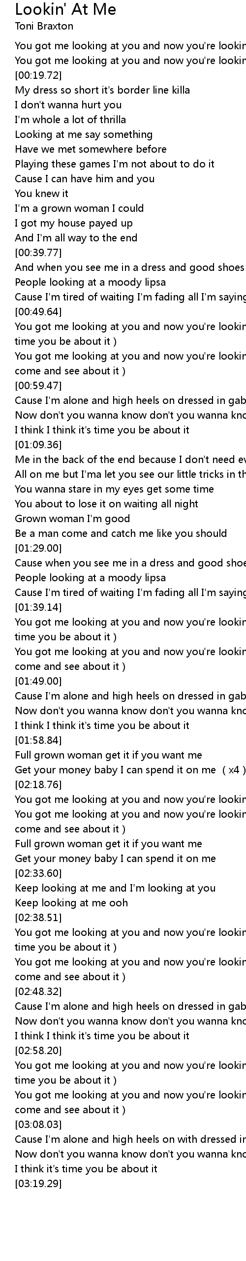 | [02:58.70] | You got me looking at you and now you're looking at me (I think it's time you be about it) |