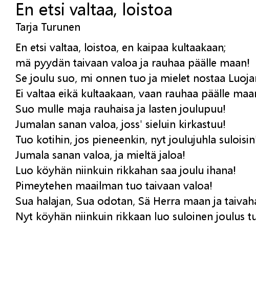 | Ei valtaa eikä kultaakaan, vaan rauhaa päälle maan! | |