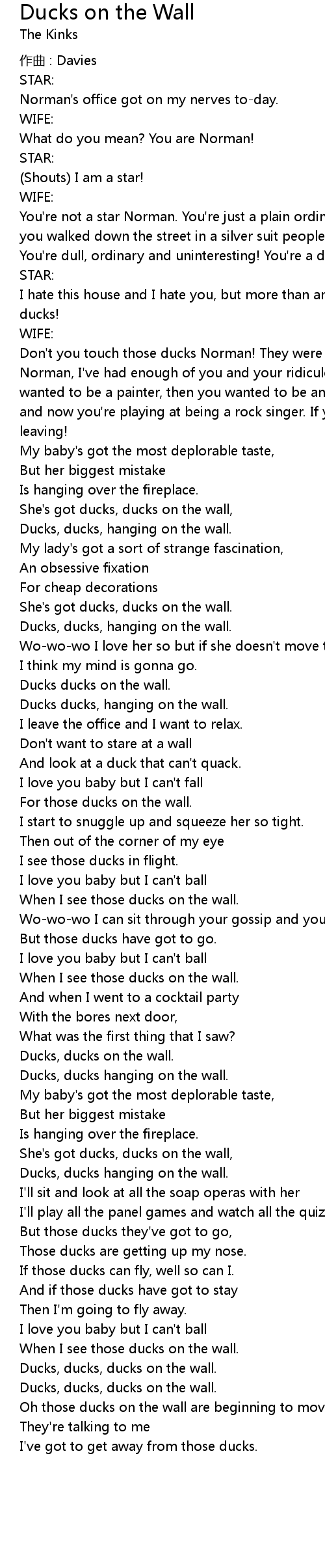 | Don' t you touch those ducks Norman! They were a present from my mother. Look, Norman, I' ve had enough of you and your ridiculous fantasies. First of all you wanted to be a painter, then you wanted to be an astronaut, then a footballer and now you' re playing at being a rock singer. If you touch those ducks I' m leaving! | |