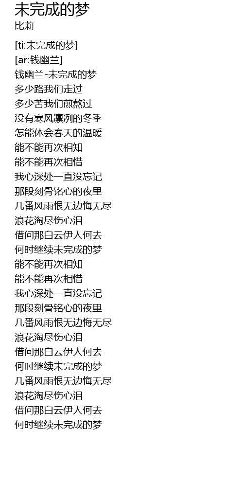 | [00:00.413] | 钱幽兰-未完成的梦 |