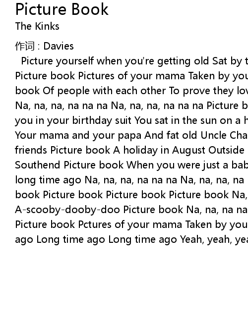 | Picture yourself when you' re getting old Sat by the fireside, apondering on Picture book Pictures of your mama Taken by your papa A long time ago Picture book Of people with each other To prove they loved each other A long time ago Na, na, na, na na na Na, na, na, na na na Picture book Picture book A picture of you in your birthday suit You sat in the sun on a hot afternoon Picture book Your mama and your papa And fat old Uncle Charlie Out cruising with their friends Picture book A holiday in August Outside a bed and breakfast In sunny Southend Picture book When you were just a baby Those days when you were happy A long time ago Na, na, na, na na na Na, na, na, na na na Picture book Picture book Picture book Picture book Picture book Na, na, na na Na, na, na na Ascoobydoobydoo Picture book Na, na, na na Na, na, na na Ascoobydoobydoo Picture book Pctures of your mama Taken by your papa A long time ago Long time ago Long time ago Long time ago Yeah, yeah, yeah |