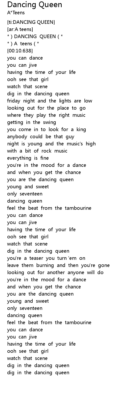 | [01:35.345] | dancing queen |