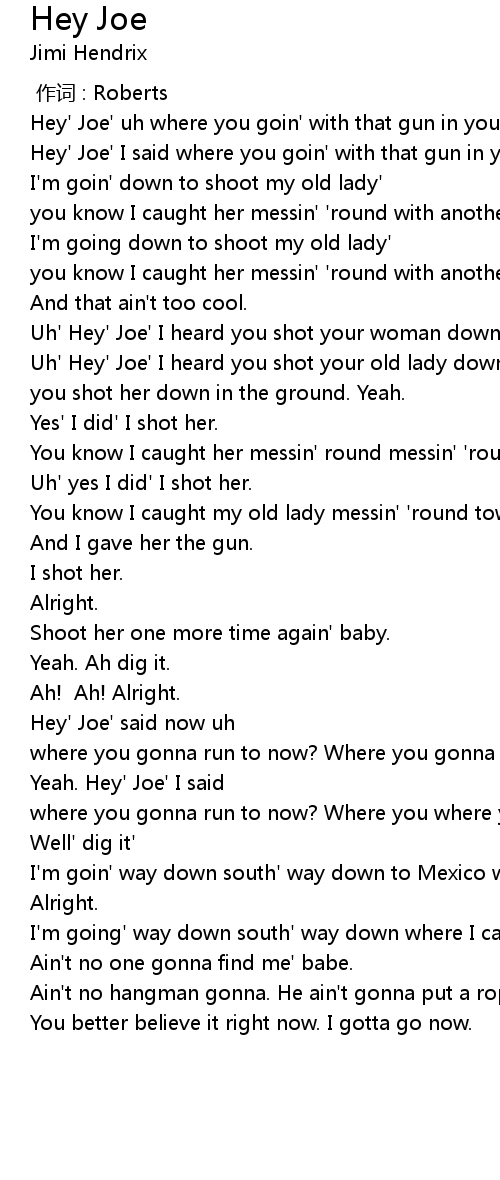 | [00:21.35] | Hey' Joe' I said where you goin' with that gun in your hand? Alright. |