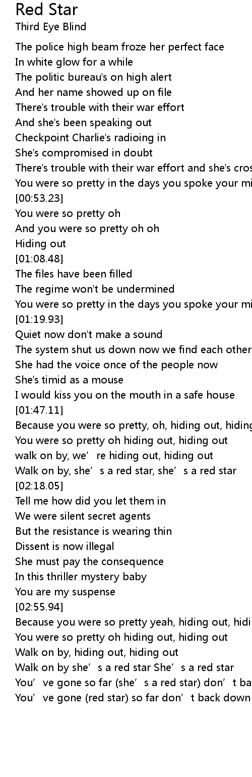 | [02:09.63] | Walk on by, she’s a red star, she’s a red star |
