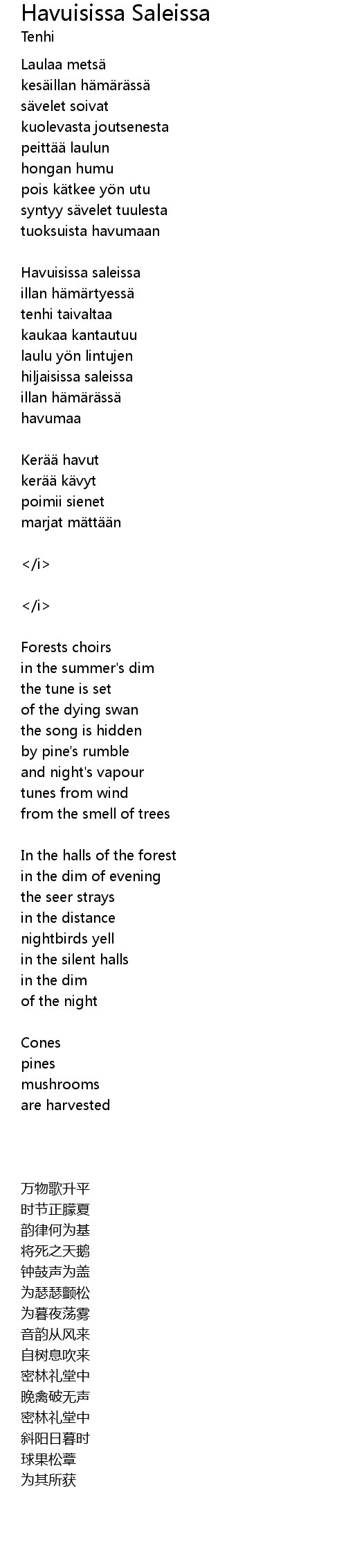 | Song | Havuisissa Saleissa |