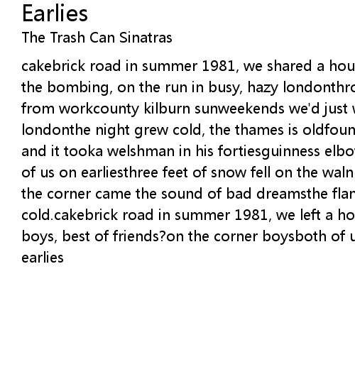cakebrick road in summer 1981, we shared a house and gardenat the height of all the bombing, on the run in busy, hazy londonthrough t-shirt breezes walking home from workcounty kilburn sunweekends we'd just wash away the dirt of busy, hazy londonthe night grew cold, the thames is oldfound that manners count for nothing and it tooka welshman in his fortiesguinness elbows rest upon a tabletopthe two of us on earliesthree feet of snow fell on the walnut roadtwo feet trudgedround the corner came the sound of bad dreamsthe flame is old. the thames is cold.cakebrick road in summer 1981, we left a house and gardenon the corner boys, best of friends?on the corner boysboth of us on earliestwo of us on earlies