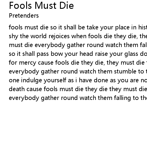 fools must die so it shall be take your place in history show your face don't be shy the world rejoices when fools die they die, they must die they die, they must die everybody gather round watch them falling to the ground fools must die so it shall pass bow your head raise your glass don't ask when don't ask why ask for mercy cause fools die they die, they must die they die, they must die everybody gather round watch them stumble to the ground fools must die one by one indulge yourself as i have done as you are now so once was i prepare for death cause fools must die they die they must die they die they must die everybody gather round watch them falling to the ground. |