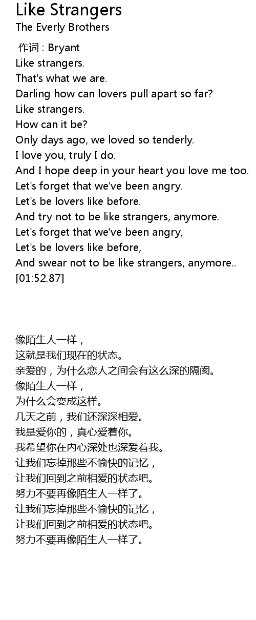 | [01:20.67] | And try not to be like strangers, anymore. |