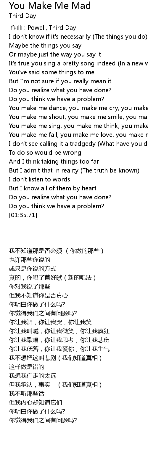 | [00:44.85] | You make me shout, you make me smile, you make me mad |