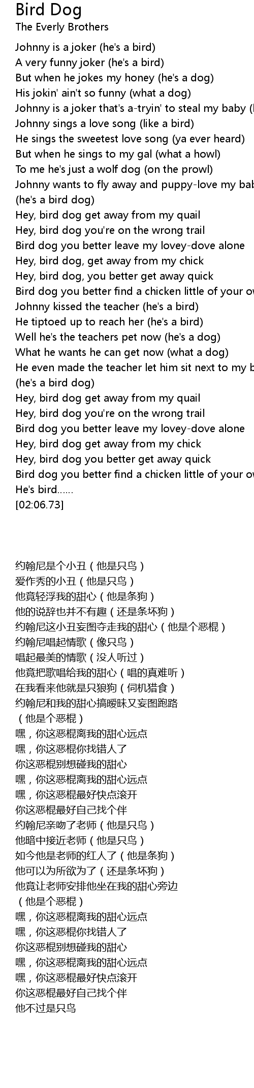 | [00:53.39] | Bird dog you better leave my loveydove alone |