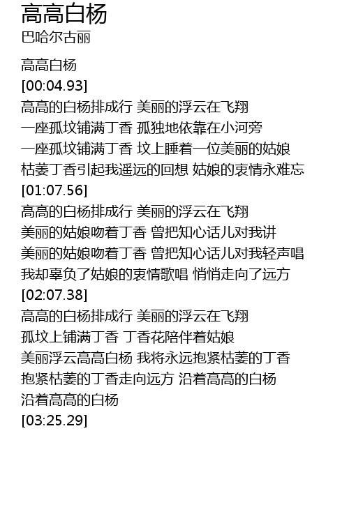 | [02:21.49] | 高高的白杨排成行 美丽的浮云在飞翔 |