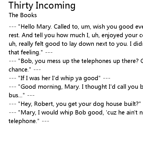 --- "Hello Mary. Called to, um, wish you good evening and, uh, wish you good rest. And tell you how much I, uh, enjoyed your company, uh, last evening. It, uh, really felt good to lay down next to you. I didn't realize how much I missed that feeling." --- |