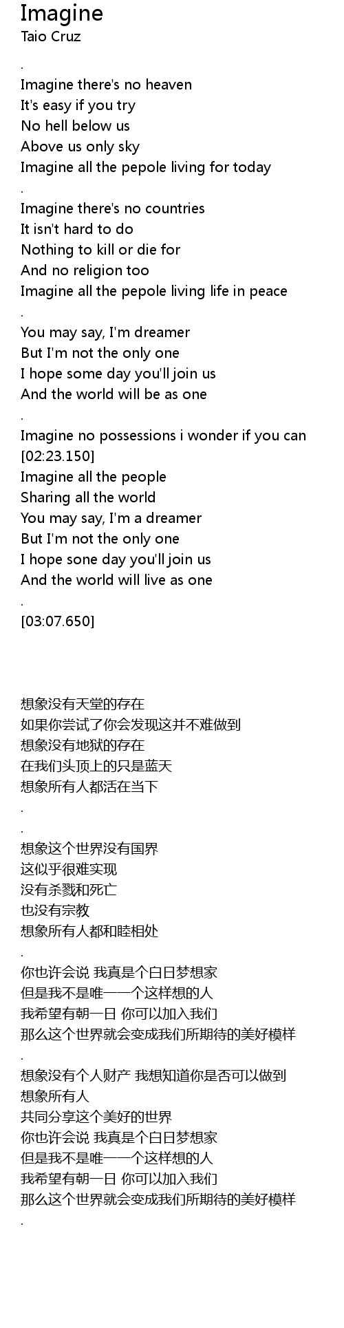 | [02:09.920] | Imagine no possessions i wonder if you can |
