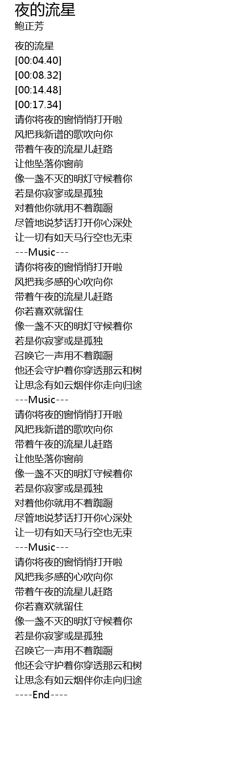 | [00:19.16] | 请你将夜的窗悄悄打开啦 |