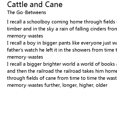 | I recall a bigger brighter world a world of books and silent times in thought and then the railroad the railroad takes him home through fields of cattle through fields of cane from time to time the waste memory-wastes the waste memory-wastes further, longer, higher, older |