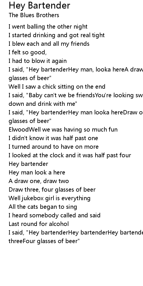 I said, "Hey bartenderHey bartenderHey bartenderHey bartenderDraw one, two, threeFour glasses of beer" |