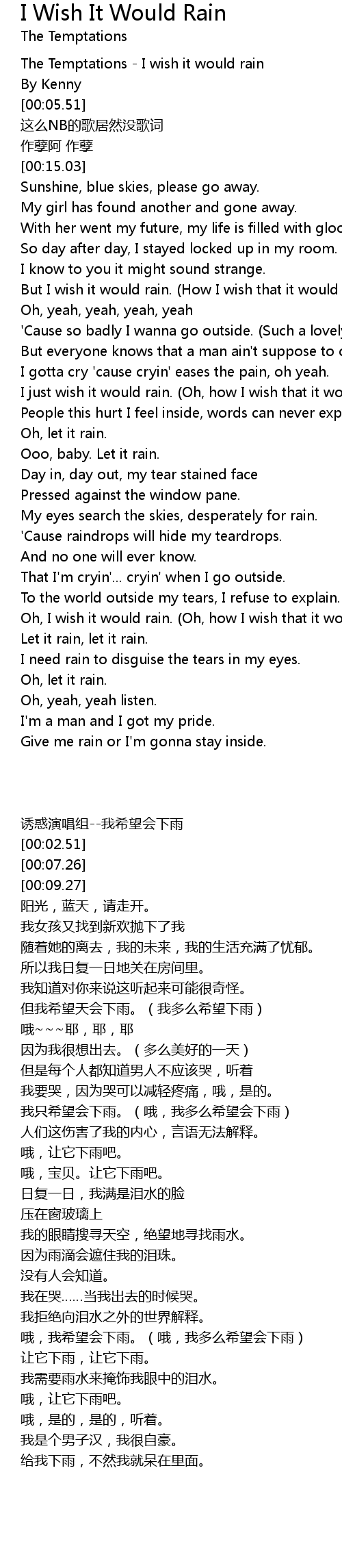 | [00:43.58] | But I wish it would rain. (How I wish that it would rain) |
