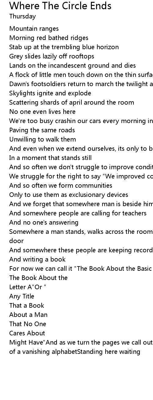 | Might Have"And as we turn the pages we call out the sounds of nothingThe sounds of a vanishing alphabetStanding here waiting |