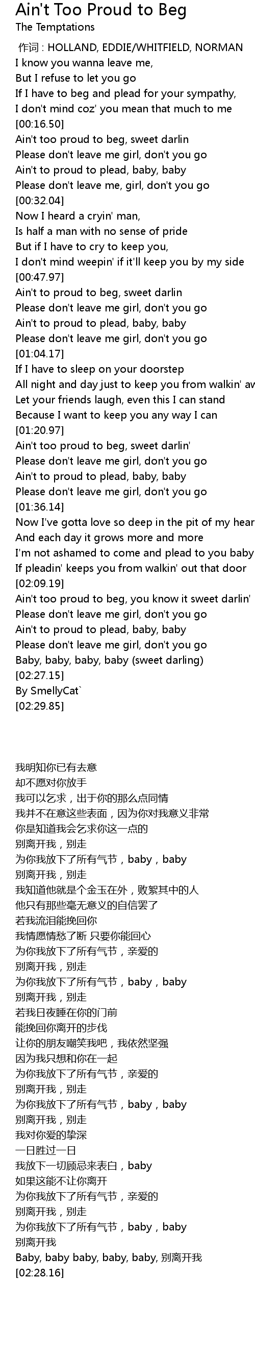 | [02:09.78] | Ain' t too proud to beg, you know it sweet darlin' |