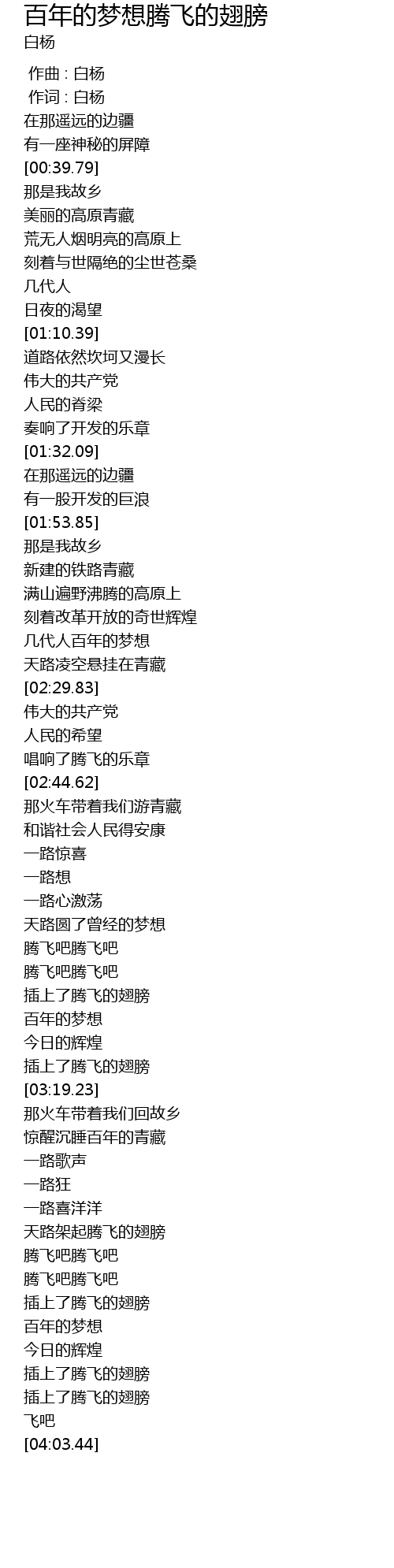 百年的梦想腾飞的翅膀 bai nian de meng xiang teng fei de chi bang Lyrics