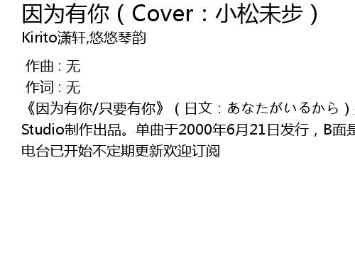 | [00:02:00] | 《因为有你/只要有你》(日文:あなたがいるから)是日本流行歌手小松未步的第10张单曲,由她包办词曲,池田大介编曲,GIZA Studio制作出品。单曲于2000年6月21日发行,B面是《哀伤的恋情》。该曲亦成为日本动漫《名侦探柯南》第四部剧场动画《瞳孔中的暗杀者》的主题曲。 |