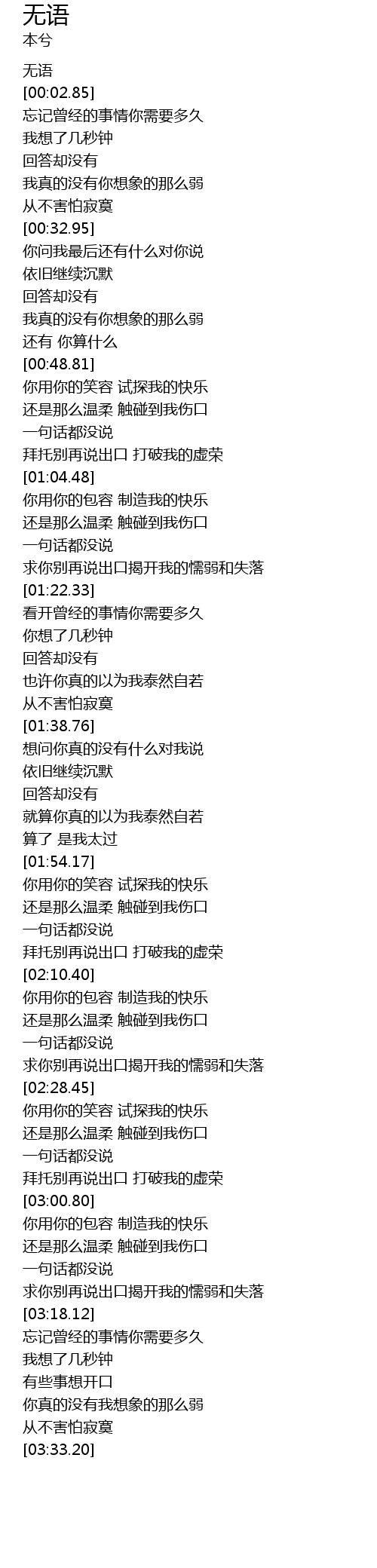 | [03:10.78] | 求你别再说出口揭开我的懦弱和失落 |