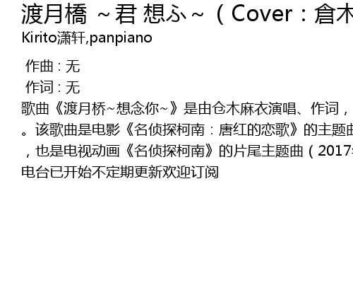 | [00:03:00] | 歌曲《渡月桥~想念你~》是由仓木麻衣演唱、作词,德永晓人作曲、编曲的作品 。该歌曲是电影《名侦探柯南:唐红的恋歌》的主题曲 ,也是电视动画《名侦探柯南》的片尾主题曲(2017年10月7日起) |