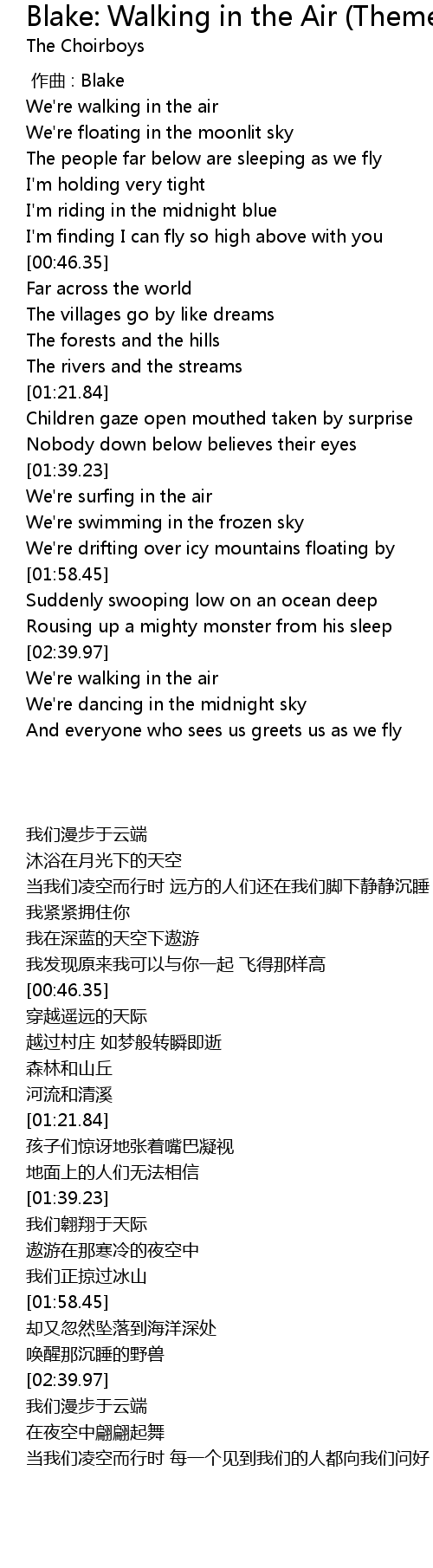 | Song | Blake: Walking in the Air (Theme from 'The Snowman') |