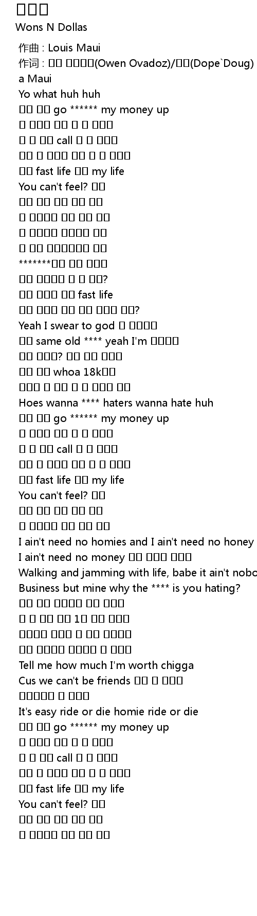 | [01:17.454] | 말은 됐어 go ****** my money up |