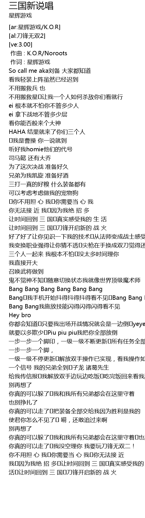 | [02:44.11] | nǐ bù yòng dān xīn wǒ nǐ xū yào dāng xīn wǒ nǐ wú fǎ jiē jìn wǒ yīn wèi wǒ jué zhāo duō ràng shí jiān huí dào sān guó zhēn shí gǎn shòu wǒ de shēng huó ràng shí jiān huí dào sān guó dāo fēng kāi qǐ xīn de zhàn huǒ |