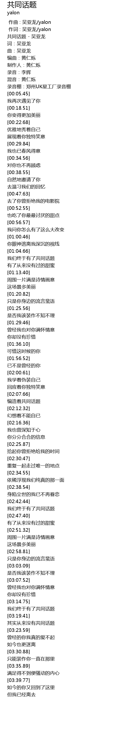 | [00:00.35] | 共同话题 - 吴亚龙 |