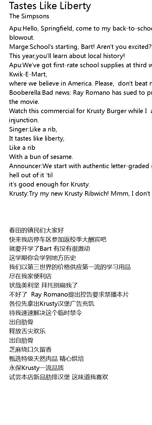 [01:03.12] Krusty:Try my new Krusty Ribwich! Mmm, I don't mind the taste!
