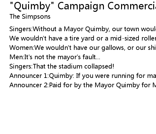 | [00:15.93] | Announcer 1:Quimby: If you were running for mayor, he'd vote for you. |