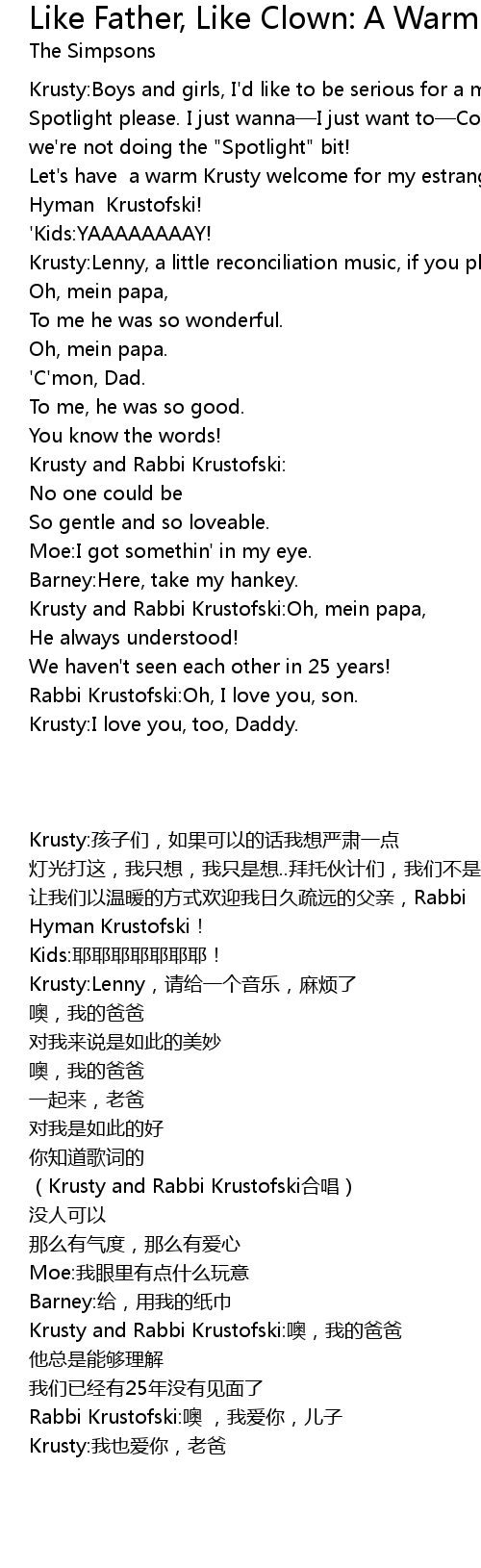 | [00:12.290] | Let's have a warm Krusty welcome for my estranged father, Rabbi Hyman Krustofski! |