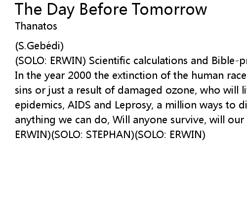 | (SOLO: ERWIN) Scientific calculations and Bible-prophecies predict a world's end In the year 2000 the extinction of the human race will begin Punishment for our sins or just a result of damaged ozone, who will live to tell? Earthquakes and epidemics, AIDS and Leprosy, a million ways to die If it's true, is there anything we can do, Will anyone survive, will our entire race die?! (SOLO: ERWIN)(SOLO: STEPHAN)(SOLO: ERWIN) |