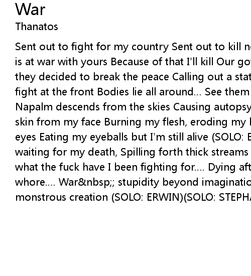| Sent out to fight for my country Sent out to kill not to reason why My country is at war with yours Because of that I' ll kill Our governments did not agree, So they decided to break the peace Calling out a state of war Commanding us to fight at the front Bodies lie all around See them rotting, smell the stench Napalm descends from the skies Causing autopsy whilst being alive Peeling the skin from my face Burning my flesh, eroding my bones Maggots crawling out of my eyes Eating my eyeballs but I' m still alive SOLO: ERWIN As I lie here rotting, waiting for my death, Spilling forth thick streams of blood and pus, I wonder what the fuck have I been fighting for. Dying after being used like a whore. War nbsp stupidity beyond imagination Death the result of this monstrous creation SOLO: ERWIN SOLO: STEPHAN SOLO: ERWIN |
