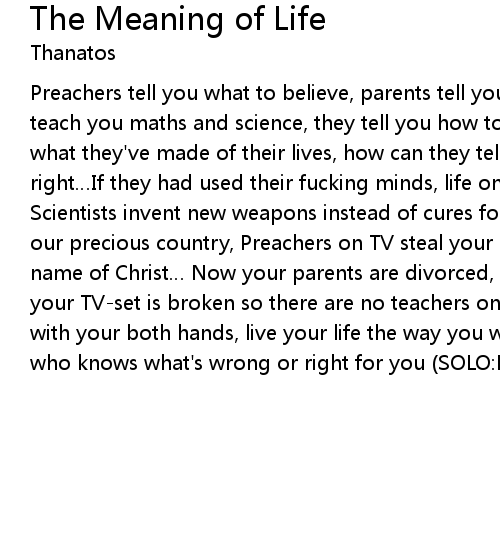 | Preachers tell you what to believe, parents tell you how to behave Teachers teach you maths and science, they tell you how to live your life But look at what they've made of their lives, how can they tell us what's wrong or what's right…If they had used their fucking minds, life on earth would be just fine Scientists invent new weapons instead of cures for diseases, all for the sake of our precious country, Preachers on TV steal your money and your soul, all in the name of Christ… Now your parents are divorced, your teacher's in a sanitarium, your TV-set is broken so there are no teachers on the screen; Grab this chance with your both hands, live your life the way you want cause you're the only one who knows what's wrong or right for you (SOLO:ERWIN) |